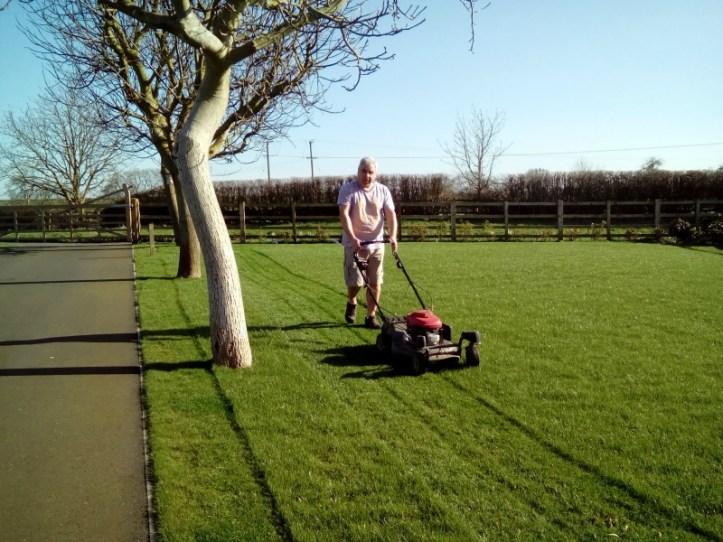 The grounds are extensive don’t you know! Secretly I think he quite enjoyed it – did stripes and everything. Now we have an Old Trafford-esk lawn. J