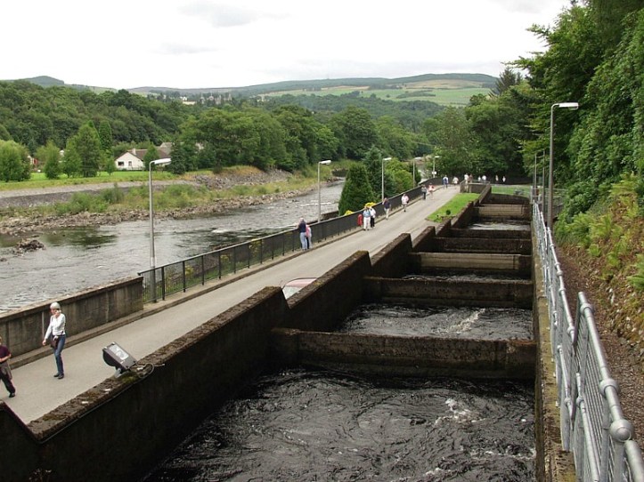 Pitlochry is a busy little town. Among other things, it seems to be a coach stop for the tours of the Perthshire Highlands. Lots of people heading off to the coffee shops and gift shops. It is the centre for lots of outdoor activities and, of course, there is the Fish Ladder. The “ladder” is next to the power station in Pitlochry on the River Tummel and it allows the salmon to swim up stream during the breeding season. The power station’s dam would otherwise make the river impassable for the salmon. It looked quite bland out of season but I expect it is quite lively during the breeding season.
