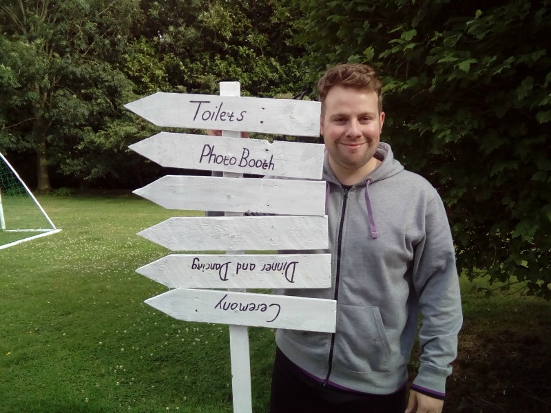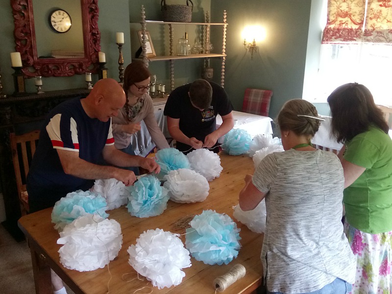 Check list of family DIY projects produced: 170 pom poms, tick; 40 tea-cup candle favours, tick; 40 scratch card favours, tick; 9 table centres, tick, 76 seating name plates, tick; 1 large seating plan, tick; 12 sign posts painted, tick; 1 photo booth, tick. One final push on the last day to decorate the outside Secret Garden and prepare the fresh cut flowers.