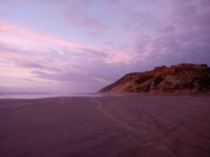 Bayly’s Beach is at the south end of the 100km long Ripiro Beach which is classed as a highway. It is quicker to reach some of the other settlements along the west coast by beach than by travelling inland on the unmade roads. A knowledge of the tides and a four wheel drive is recommended but we saw a few family hatchbacks braving it. Apart from that you can hire a quad bike from the nearby camp site. The only way for us was, of course, JWalking so we took both an afternoon and a sunset walk along the cliffs and onto the beach. It is a dramatic coast and crazy to see a car go by and the lights disappear when they get too far away to see anymore.