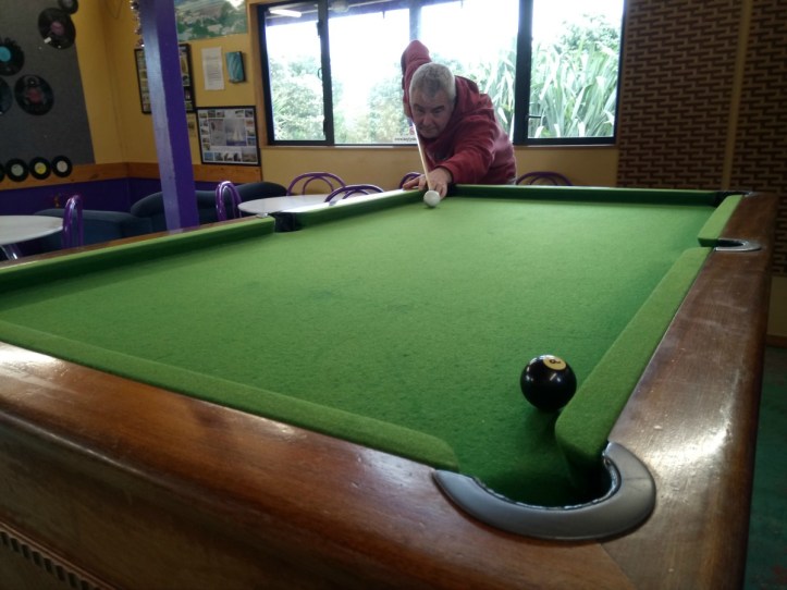 • You know Jonno oh so well. After a poor start by him he caught me up and it was down to the black. I like to think it was my pro shot rather than him missing the black that clinched it for me. Although he blamed the brick wall about 2ft from the table. But I think it’s all those years of being with our “boys” watching and playing that must have paid off. We are loving being back here and Northland is spectacular….