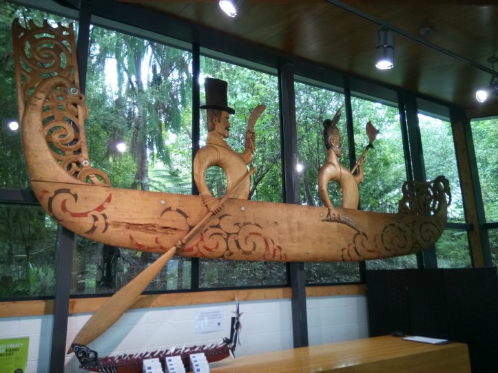 North of Paihia on the edge of Te Ti Bay you can “Experience the Day that Changed History“. This is how the literature about the historic Waitangi Treaty Grounds is worded. In a nutshell it is where the Declaration of Independence of New Zealand was signed in 1835, then five years later the Treaty of Waitangi between the British Crown and the indigenous Māori. Controversy is rife surrounding the whole thing. The documents were drawn up by European settlers without any legal background and then translated into a Māori version. These versions differed so there was no consensus as to what was actually being agreed. Broadly from the British point of view it made New Zealand a British colony and gave Queen Victoria’s government sole right to purchase land. It also gave Britain sovereignty over New Zealand and the right to govern.  Māori believed they conceded the right of governance in return for protection but without giving up their authority to manage their own affairs. There was also some debate whether some Māori chiefs opposed to the Treaty actually signed it and to what extent the British have contravened the Treaty over the years. So the controversy rumbles on and the Public Holiday of Waitangi Day, 6th February, most celebrate the day but protesters also use it as a chance to vent their feelings of frustration and injustice.