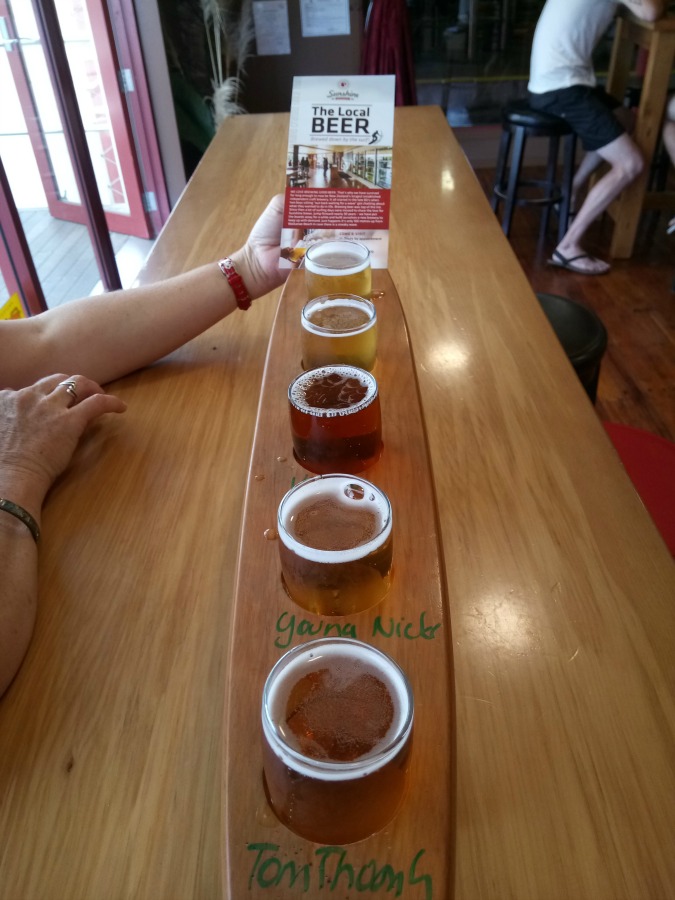 No 2 – Sunshine Brewery and Tap Room. Due to the fantastic climate, Gisborne is surrounded by wineries and there is even a cidery but we decided to head for the Sunshine Brewery. The story goes that it was opened by a couple of surf dudes who hung up their surf boards in 1989 to start a small brewery which has now grown to a much larger concern offering many more sunshine brews. One surf board shaped tasting board later the results were in. Jo favoured Young Nick (not one of the staff a light pale) and Jonno preferred Vienna – made from Germans hops so no surprises there!
