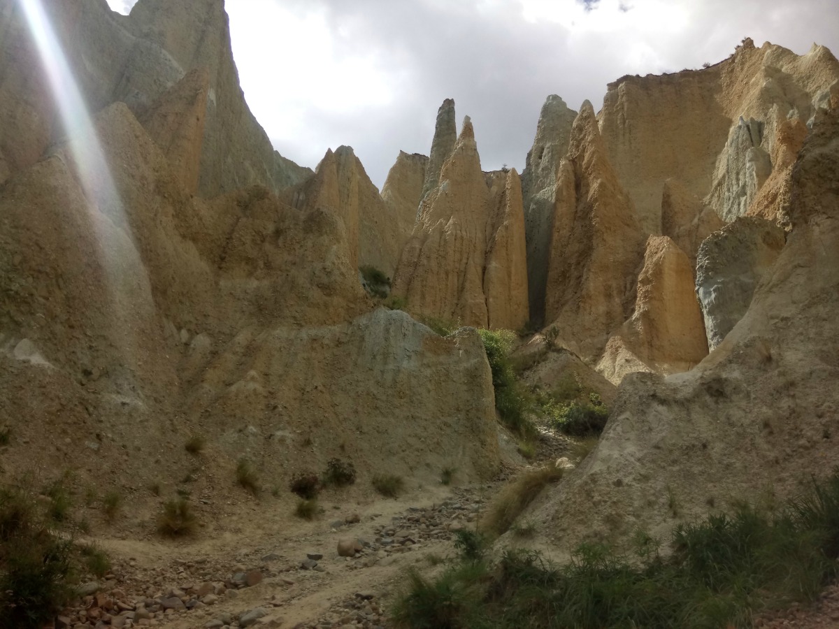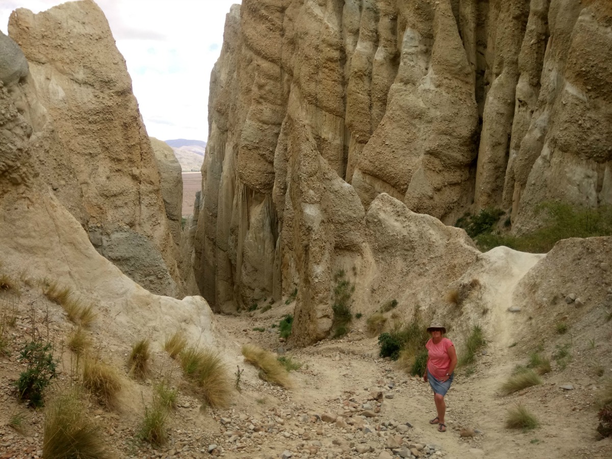 Our final excursion of the day had been recommended by our friends Gill and Ross in Wanaka, the Clay Cliffs. They are about 10km up an unsealed road north of Omarama off State Highway 8. A donation box for NZ$5 for your car gets you across the private land to get within 100 metres of the cliffs. The last bit is done on foot and sturdy shoes are recommended so you can get the most out of your visit. The cliffs are huge tall pinnacles of gravel and silt that reminded us of church, or cathedral, organ pipes. It looked like they had been placed here from another world and when the light hit them there was an array of yellows, oranges, greys. Up close, they looked like loose sand. I don’t know if you ever took a fist full of wet sand on the waters edge on the beach and let it squeeze through your hand like cake icing but it looked a bit like that.
