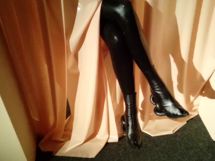The final assistant sat behind the curtain on the bar stool and let her legs protrude through. She was wearing black latex tights (there is another whole story to be told about Sam buying those) and modelling black ankle boots. The whole collection was called Bonded. Although latex has a certain reputation it is a very tangible and tactile material and should perhaps be used more in mainstream fashion.