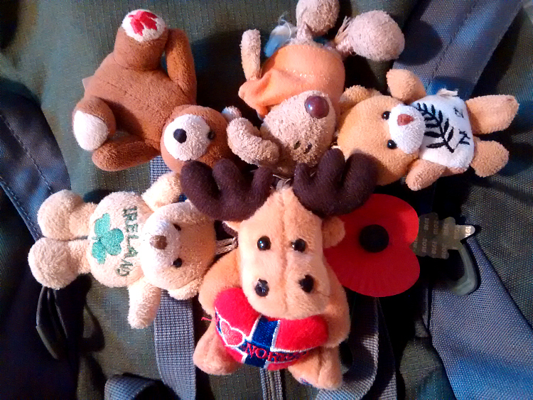 We have Brumby (Scunthorpe, England), Bay (Bay of Islands, New Zealand), Buff (Banbridge, Northern Ireland), Banff (Canada) and now I have Bergen. I have to admit that I have broken with tradition. He is a reindeer or maybe an elk not a bear but he has joined the gang and hangs around with the other guys on my backpack.