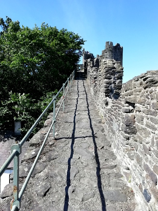 A little further on we found steps up to the wall. The walls are 1.3 km long and have 21 towers and three gatehouses. It is possible to complete the full circuit apart from one or two places where it is structurally unsafe to do so and it was refreshing to see that they are open to the public despite a few places where use of the handrails was a good option as we were above the rooftops of the town. It is remarkable that they are in such good condition and give a fantastic view back across the river to Deganwy and of the walled town below. There were a good few places to take refreshment along the route and a great new visitor centre for the castle.